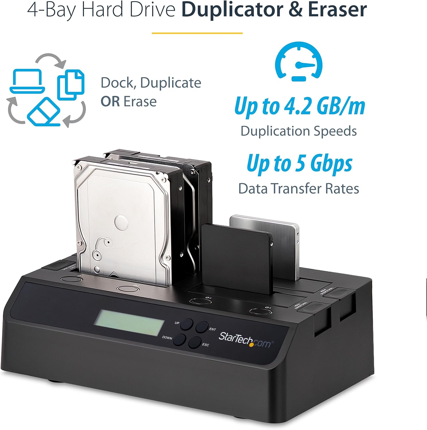 StarTech.com 4-Bay Hard Drive Duplicator and Eraser, External Standalone 1:3 HDD/SSD Cloner/Copier, USB 3.0 / eSATA to SATA Docking Station, Hard Disk Copier / Sanitizer / Wiper Tool (SATDOCK4U3RE)