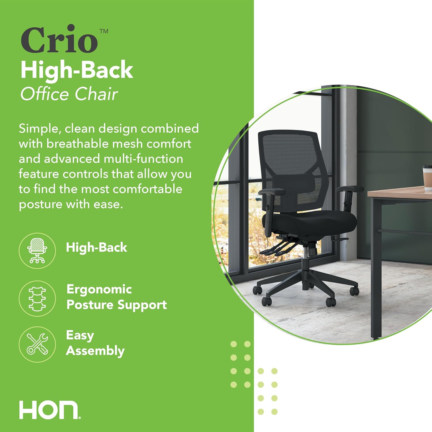 HON Crio High Back Office Chair, Ergonomic Office Chair with Adjustable Arms and Back Support, 360 Swivel, ASynchro-Tilt Recline, Black