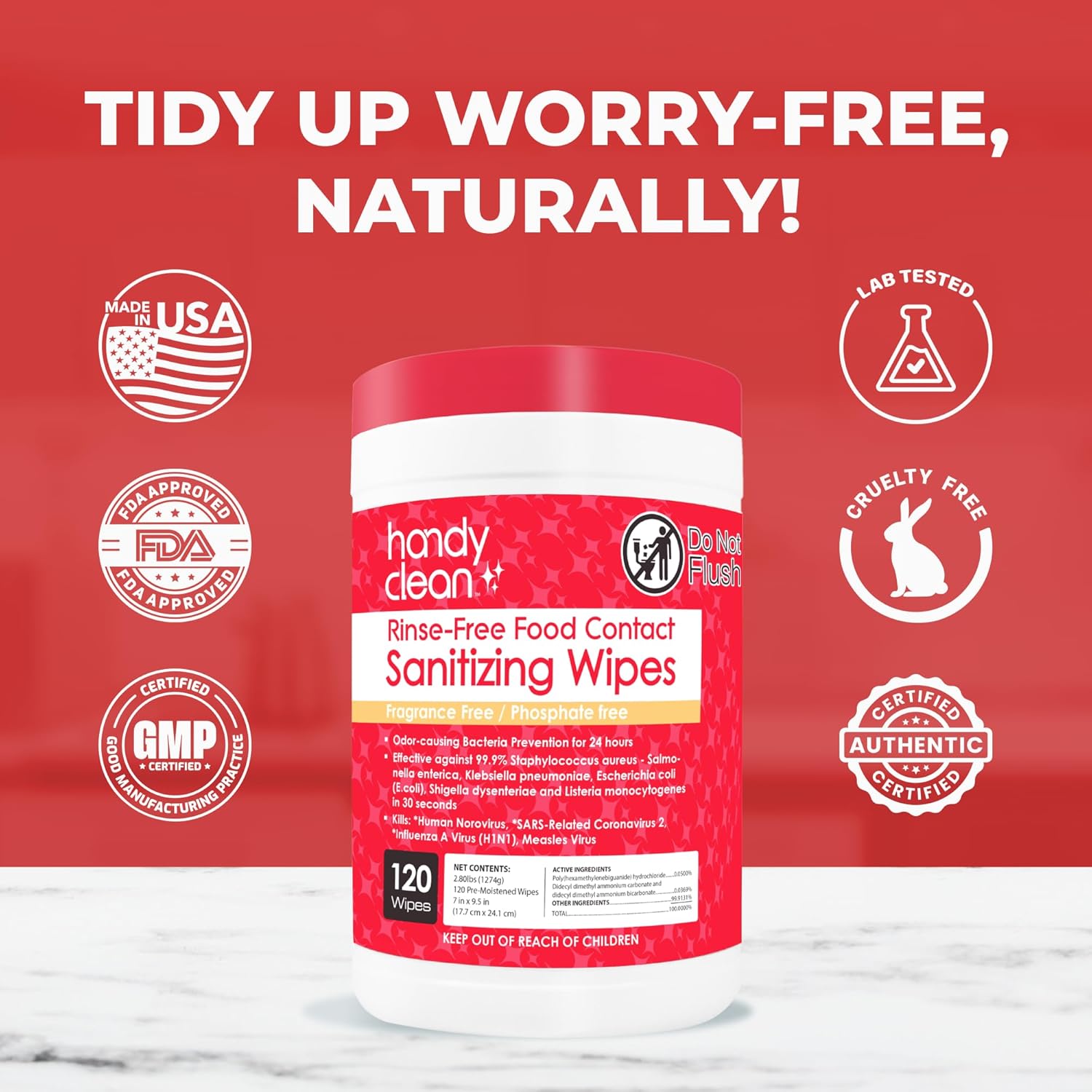 - Power in One Swipe - Effortlessly clean any area with HandyClean’s Sanitizing Wipes, rinse-free multi-surface wipes for food-contact areas; they discard 99.9% of microbes that can cause foodborne illness, prevent cross-contamination, and leave every space sparkling!