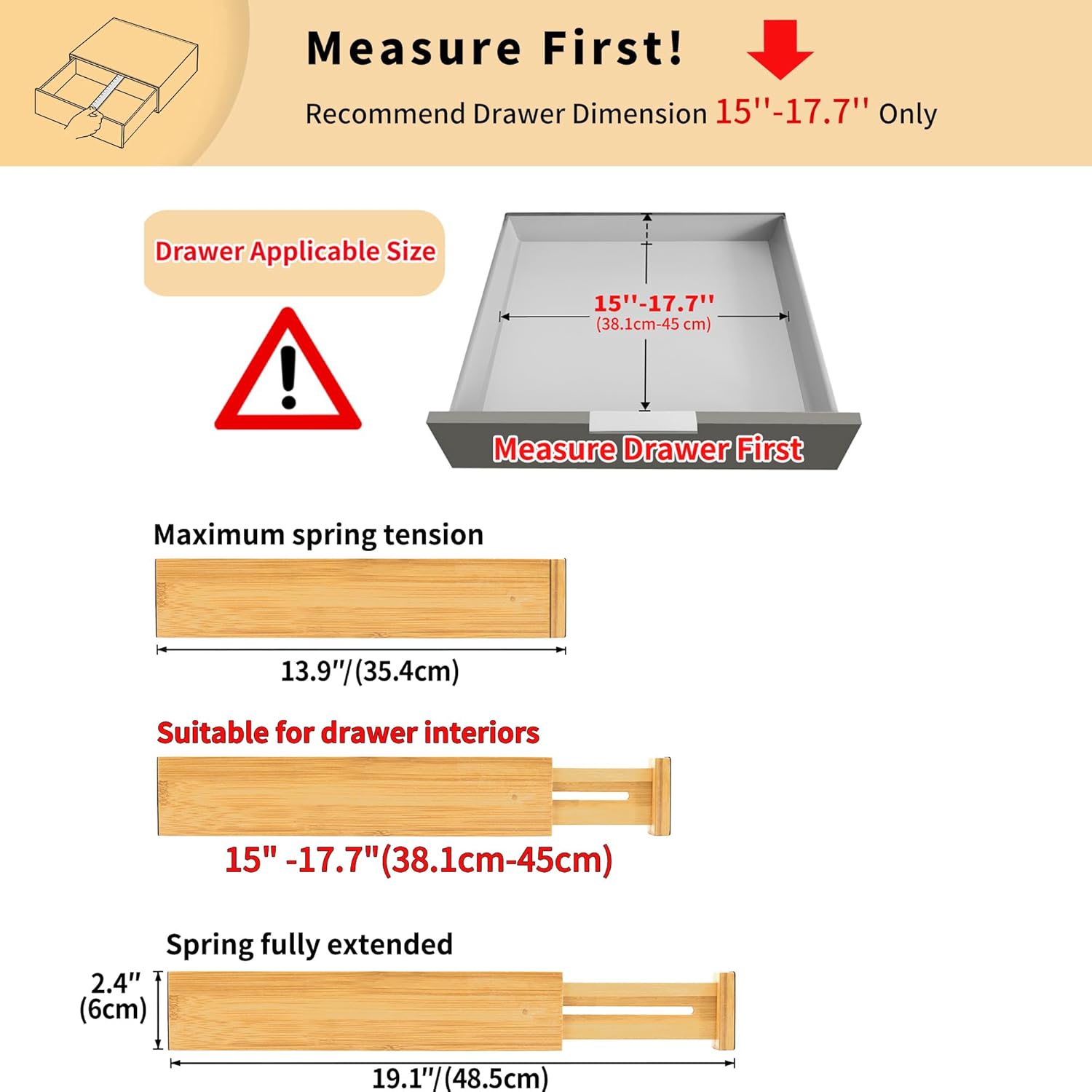 - 【Check Drawer Size Before Purchase】 **Important**: Fits drawers **15" to 17.7" wide (inner size only)**. If your drawer is **wider than 17.7"**, please opt for our **larger size**. If it's **narrower than 15"**, the divider will be **too tight or not fit properly**. **Always measure before buying!**