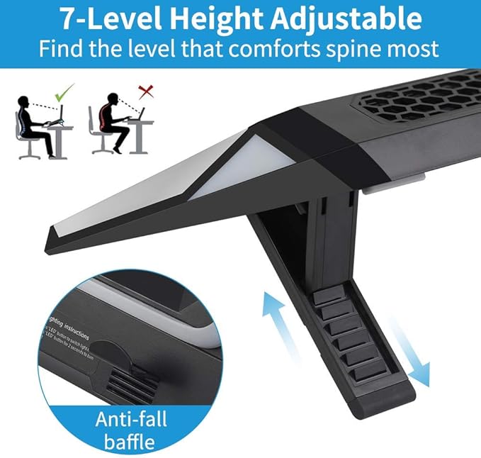 - 7 Adjustable Bracket Heights & Anti-fall Baffles: Easily adjust the height of the laptop cooler pad to adapt to your level of vision and physical posture to win ergonomic comfort especially in your spine while long hours gaming. The two baffles on the front of the laptop cooling stand ensure your expensive rig won't slide around or fall down along the incline angle. The bracket legs can be folded and hidden, and the baffles can be removed for convenience in terms of storage or moving around.