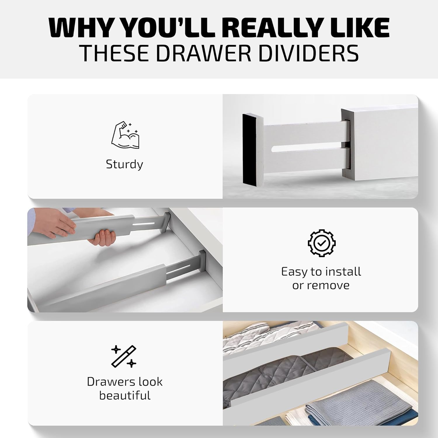 - Adjustable Length: Fit any drawer between 12.5” to 17.3” with these expandable dividers, perfect for larger drawers that tend to get messy quickly. Organize them efficiently and sustainably!