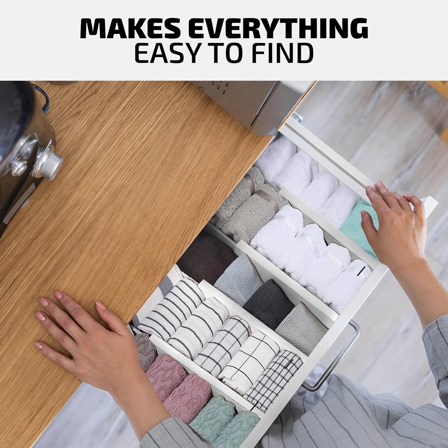- Easy to Use with Added Protection: Simply slide the divider into place in any kitchen, bedroom, office, or bathroom drawer. Equipped with EVA foam padding, it protects your drawers from scratches and ensures the divider stays securely in place without slipping. Achieve organized storage in seconds, with the flexibility to remove or reposition as needed.
