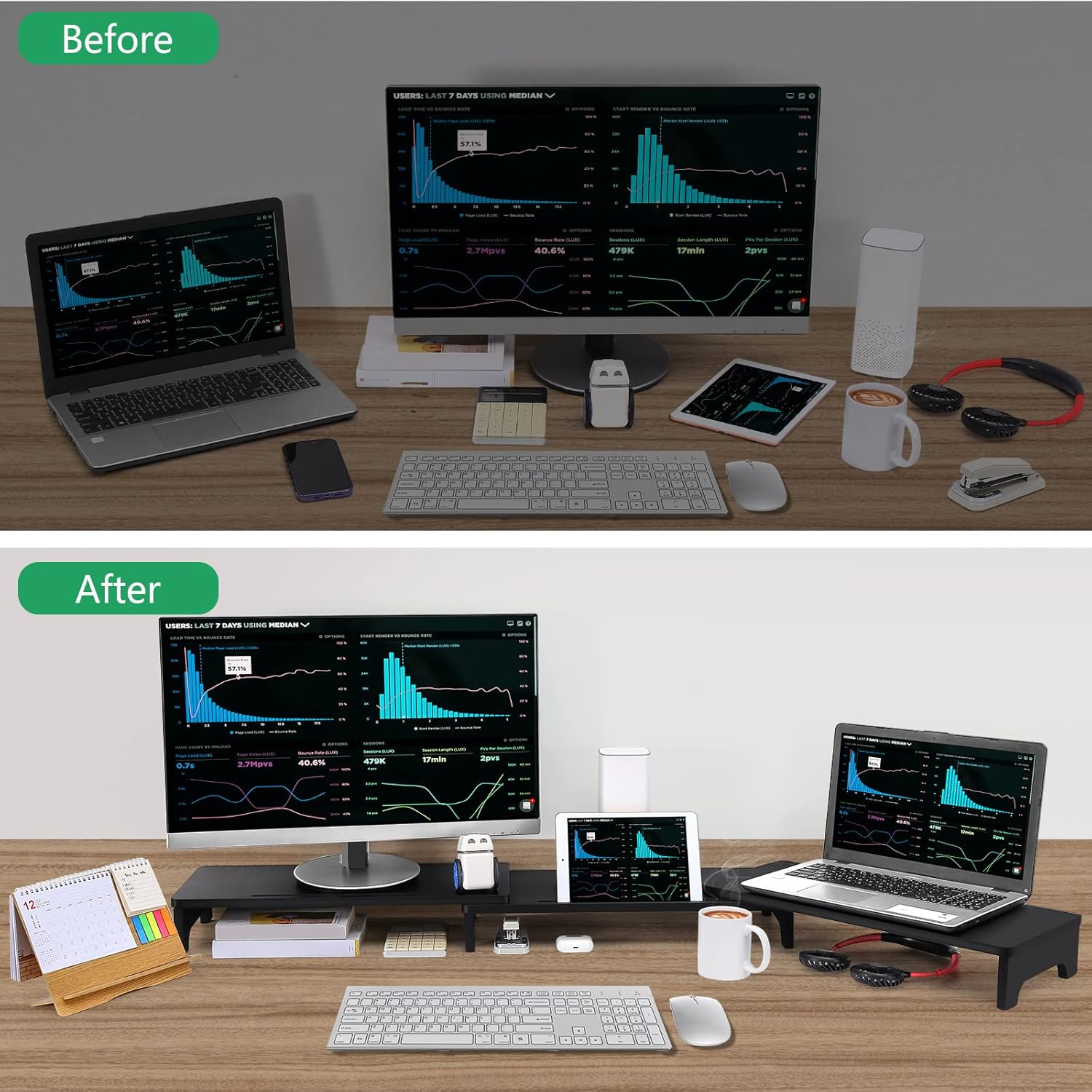 - 【Details Design for Use】Each computer monitor stand has a wide and deep tablet holder in the front of the top. The monitor shelf for desk fits for pencils or phone.Also there is a cut on the back,so the cables won't be easily in a mess or become an obstacle between wall and the shelf.Moreover, the leg base is attached with anti-slip mat, enhancing the stability of the stand.If you have any problems with the assembly, please consult us!
