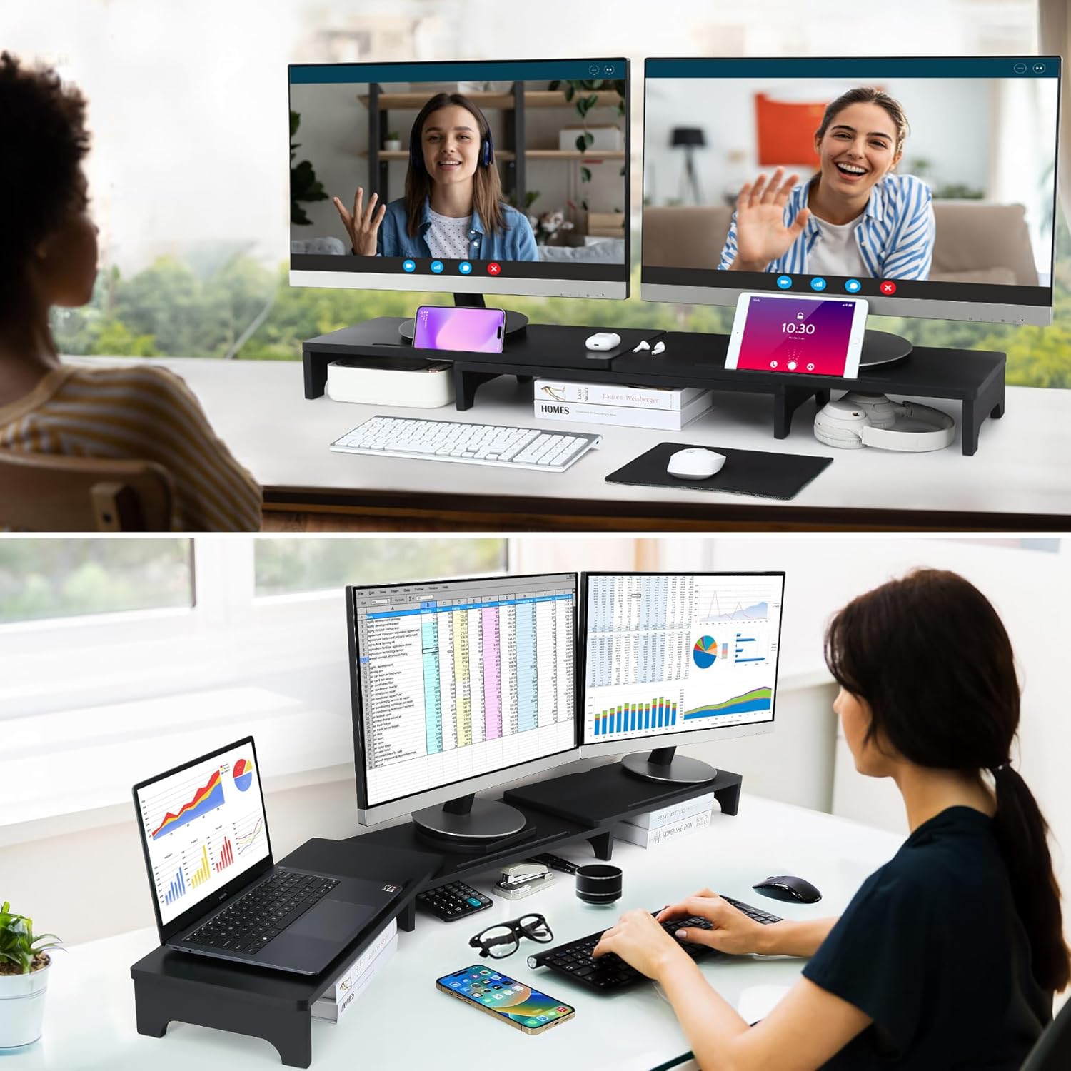 Nnewvante Monitor Stand Riser, 60 inch Large Bamboo Dual Monitor Stand for Desk, 3 Shelves Desktop Screen Riser with Adjustable Length Angle for Computer Laptop PC,Black