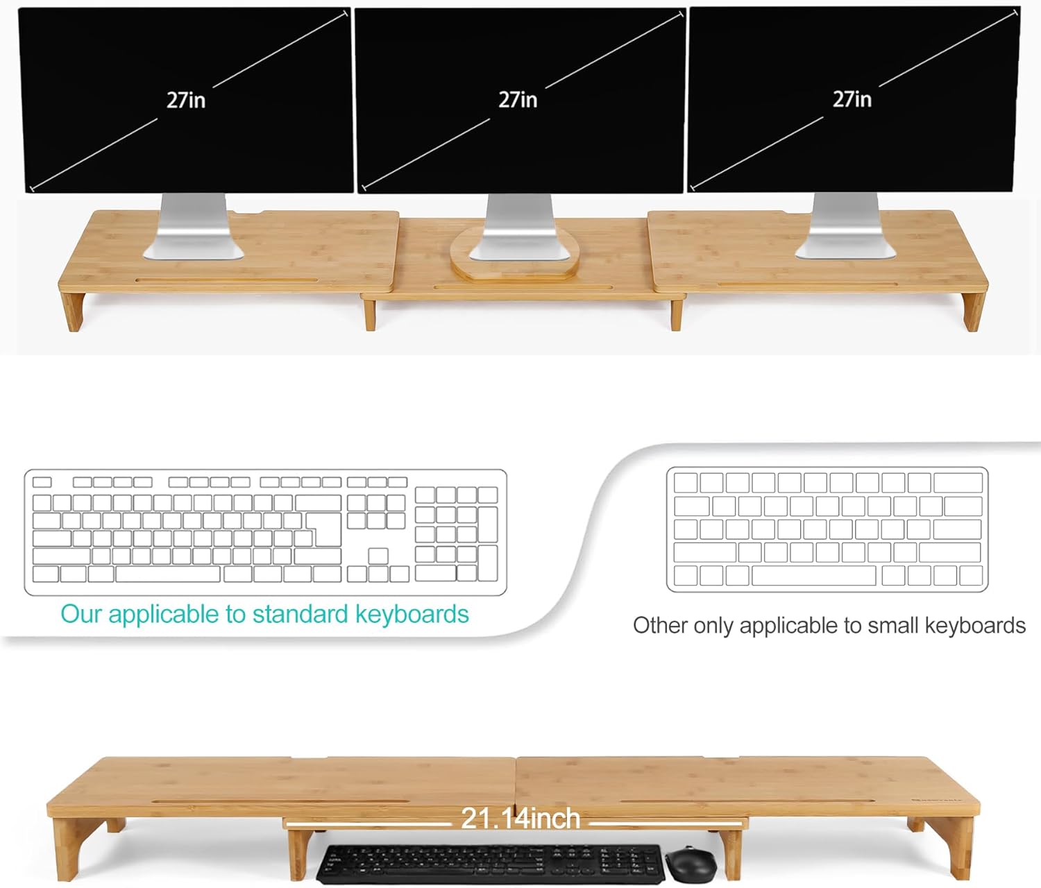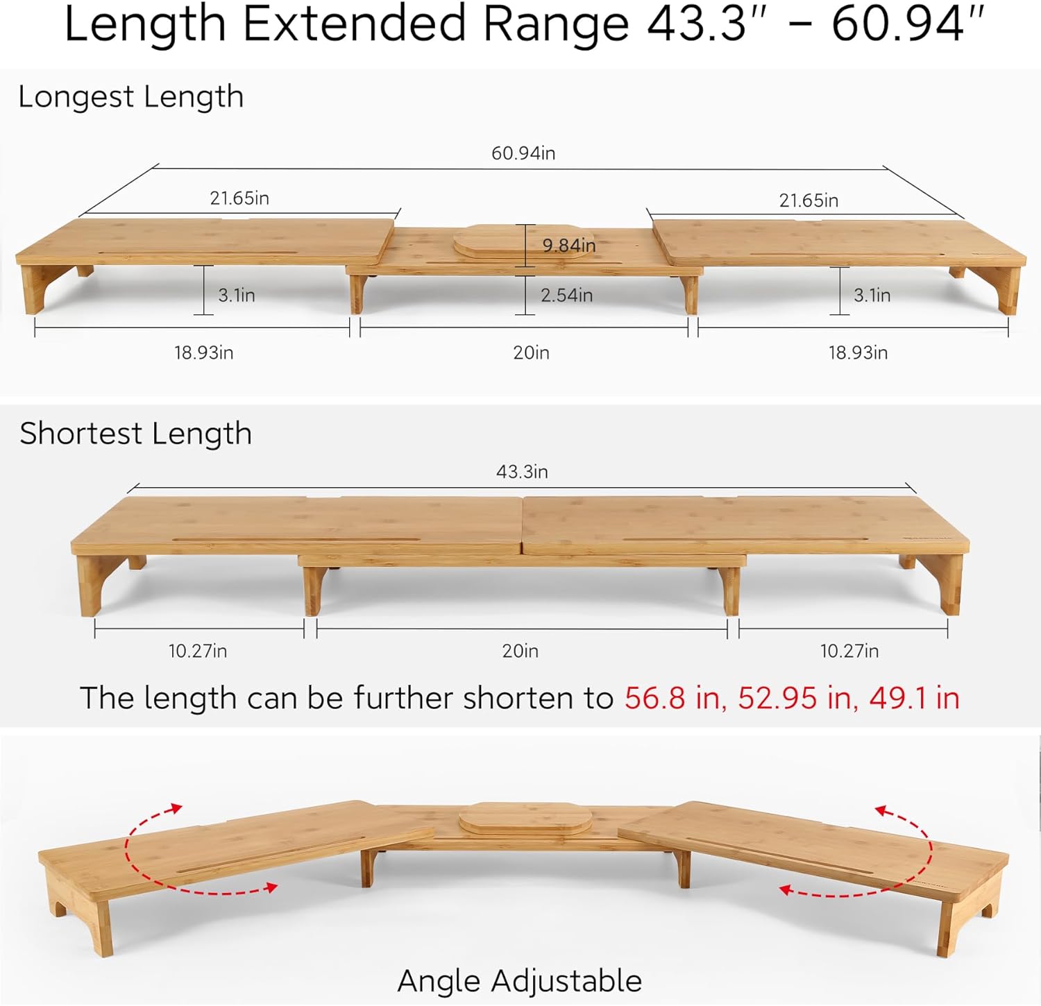 Nnewvante Monitor Stand Riser, 60 inch Large Bamboo Dual Monitor Stand for Desk, 3 Shelves Desktop Screen Riser with Adjustable Length Angle for Computer Laptop PC