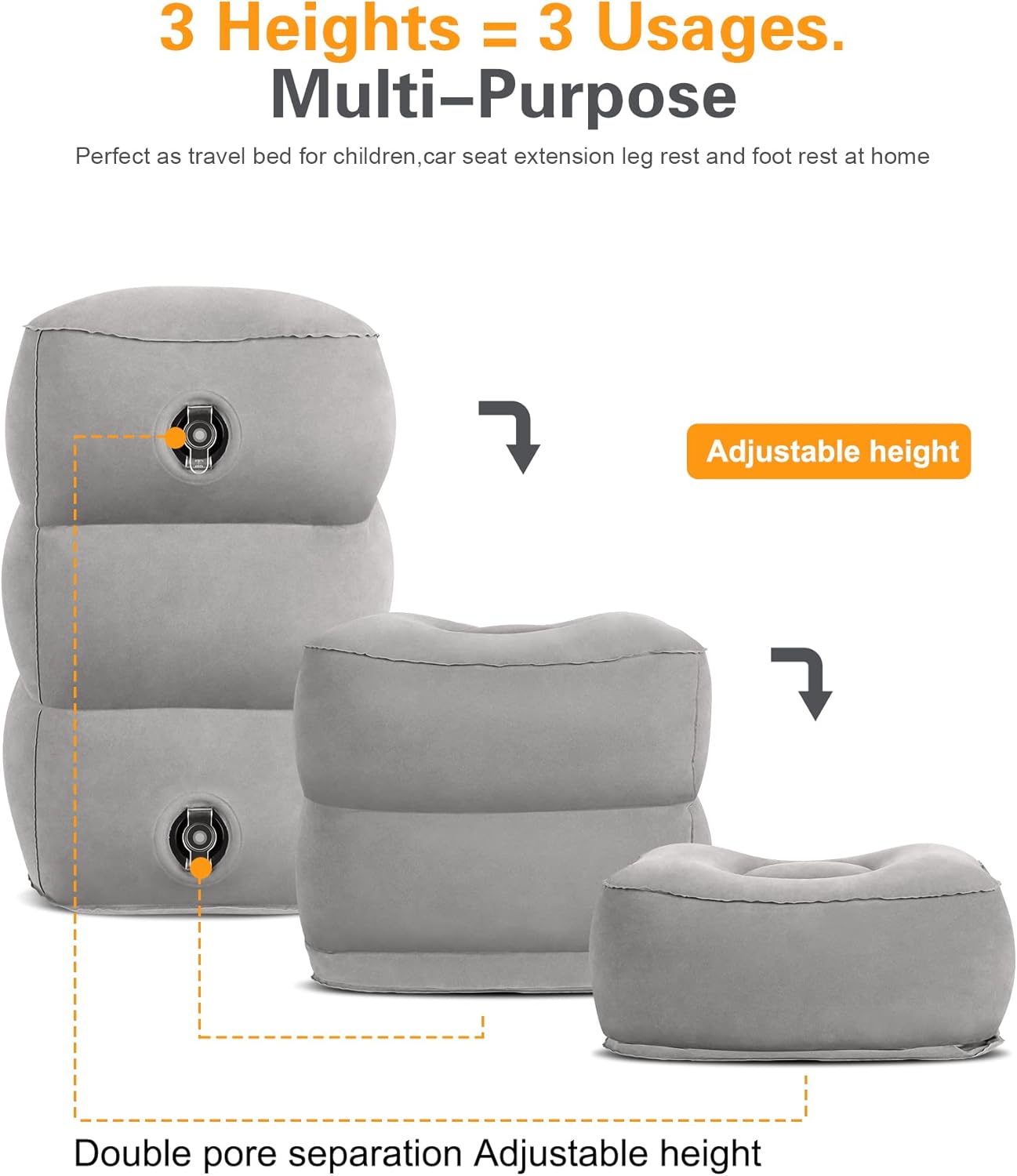 - Leg Care: Our footrest can be adjusted to three different heights at will, We can adjust the height suitable for our own use according to our comfortable posture. Physical pain is something we can't stand. Studies have shown that using a travel foot rest pillow helps blood circulation, helps reduce the risk of DVT (deep vein thrombosis), and relieves back pain caused by sitting for long periods of time.