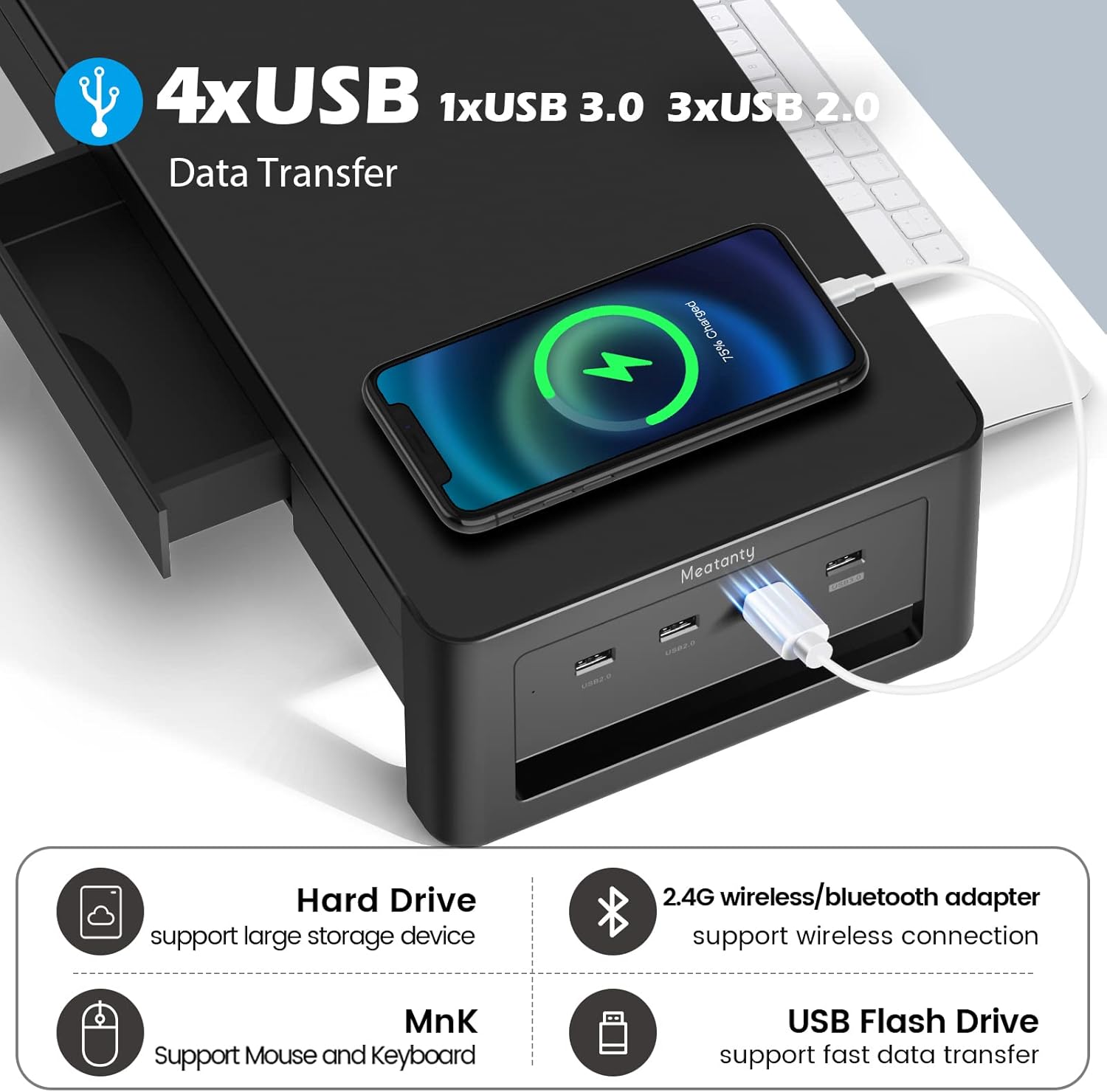 meatanty 2 in 1 Monitor Stand Riser with 2 Storage Drawers and 4 USB Ports, Metal Computer Monitor Stand Supports Transfer Data and Charging, Desk Organizer for PC,Laptop,iMac (21 inches)