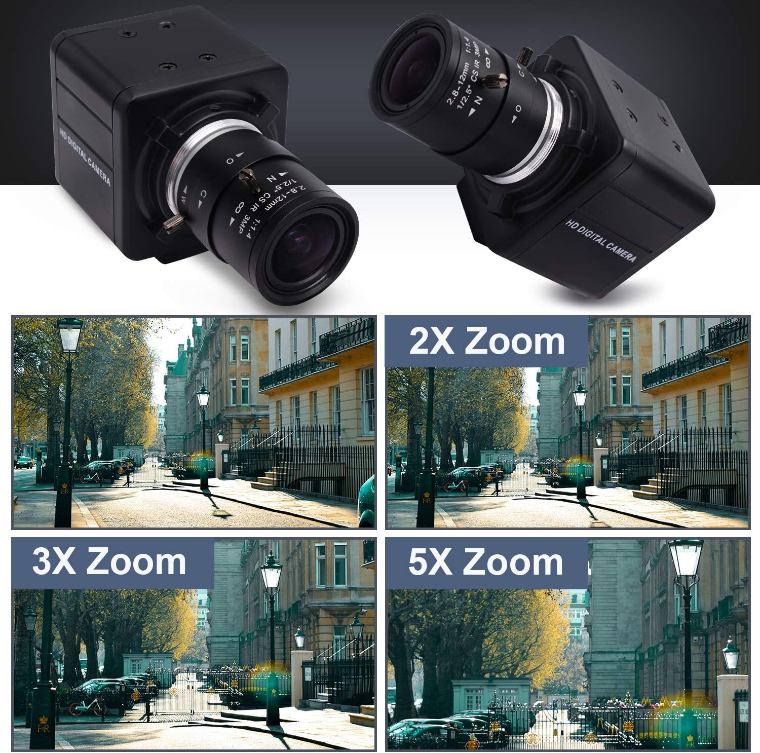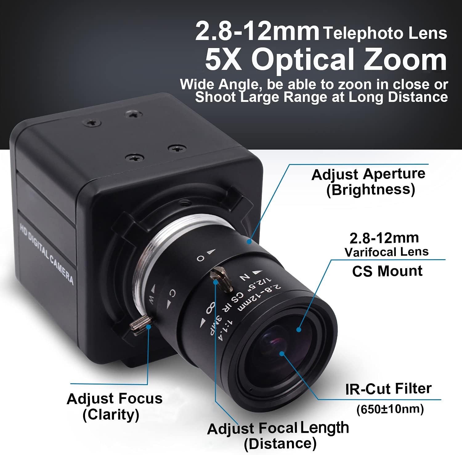- CS Mount 2.8-12mm Varifocal Lens: Optical zoom webcam with standard CS mount lens that can change. Manually adjustable focus and focal length for more applications, either close ups or long distance shots.Field of View: 15°-64°