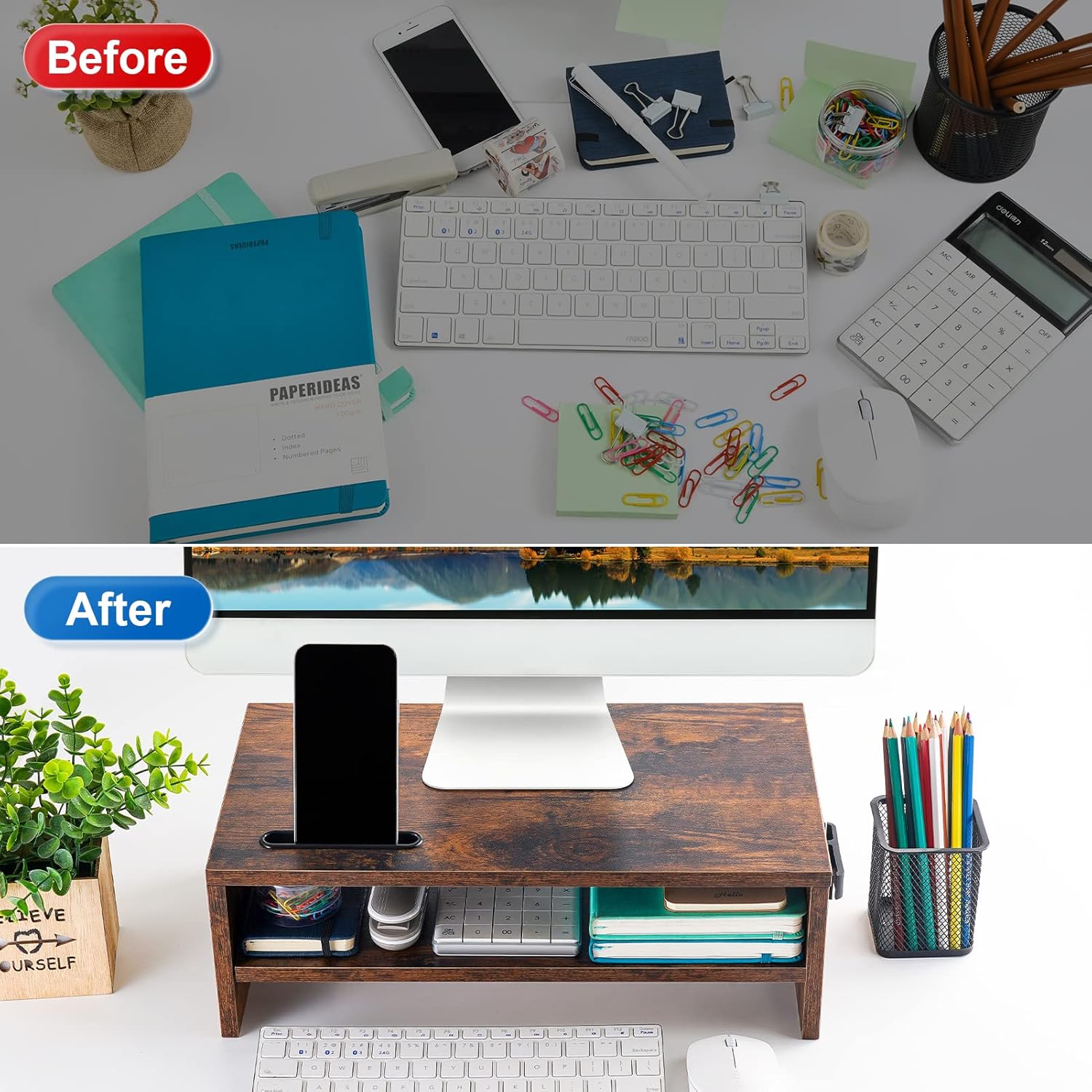 - 【SAVE SPACE, STAY ORGANIZED】 With 2 tier desktop organizer, maximum holding capacity 66lbs. You could put up your computer monitor on the top and store your keyboard or daily use office supplies underneath bottom shelf, the middle shelf helps organize your laptop and other stuff. Maximum utilize your desktop space, keep your items in order.