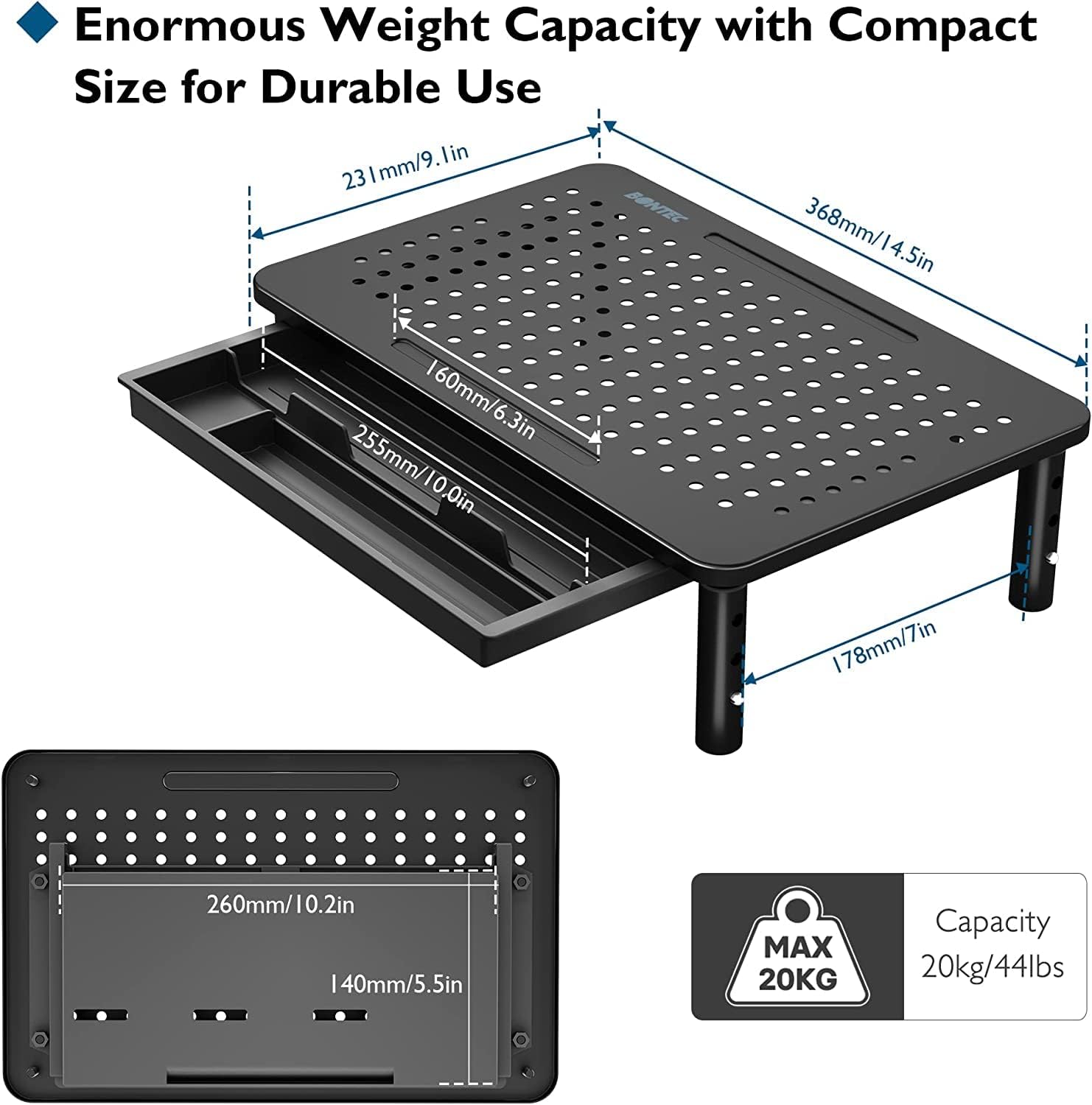 - VENTILATED MESH PLATFORM AND SPACE-SAVING DESIGN:The perforated mesh platform helps prevent overheating by allowing better airflow to your devices. The stand also includes a small drawer and a pen storage slot, providing extra space to organize pens, notebooks, and other essentials, making it perfect for decluttering your workspace