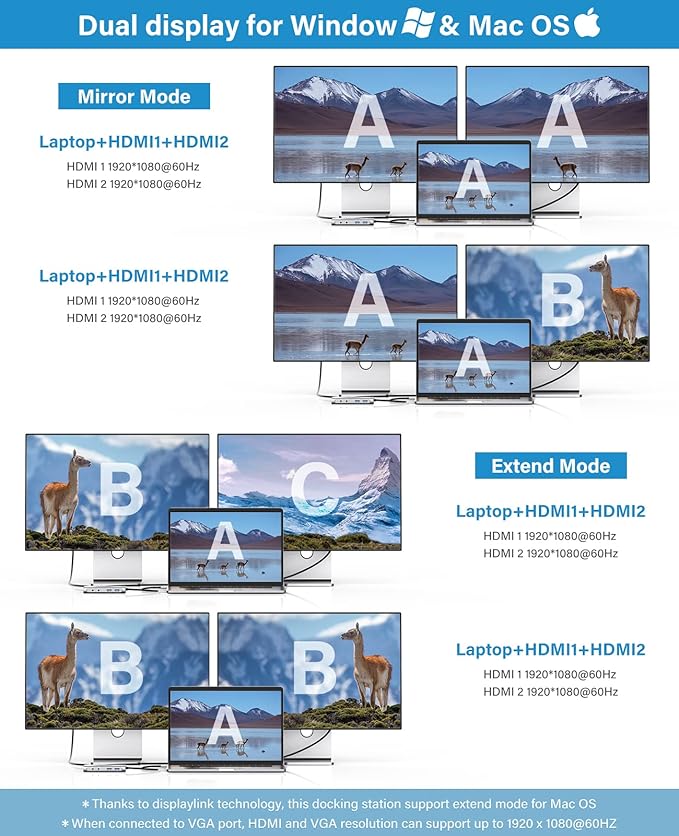 - [Don’t Forget to Install Driver Before Use] - The driver is needed when use HDMI 2 and VGA, thanks to DisplayLink technology, we can now connect up to 2 non-mirror monitors to our MacBook M1 M2 M3 and get a more stable experience while enjoying expanding external peripherals, make multitasking a breeze.