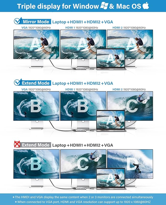 - [Maximize Your Display Options] - Featuring 2x HDMI ports and VGA port for triple display, use one or a mix of both to extend your laptop across three 1080p monitors @ 60Hz with USB, USB C, Thunderbolt 3/4 hosts. As VGA replicates the HDMI1, they display the same, meanwhile HDMI2 designed to support audio output for a better auditory experience.