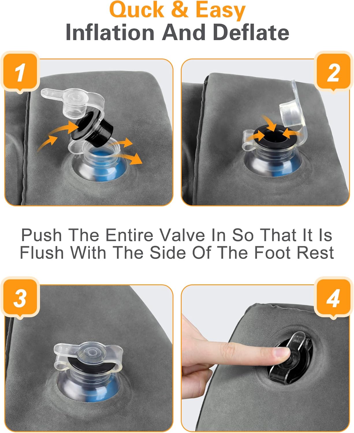 - Very User-Friendly Design: Our inflatable foot rest pillow with 2-in-1 double valve,the upper black air valve is a one-way air inlet for inflating or replenishing gas.bottom transparent air valve can be quickly inflated and deflated,when you are done blowing it up, push clear cover on and push whole valve in so that it is flush with the side of the travel foot pillow,the airplane footrest takes away the hassle of bringing a pump and making noise in flight.
