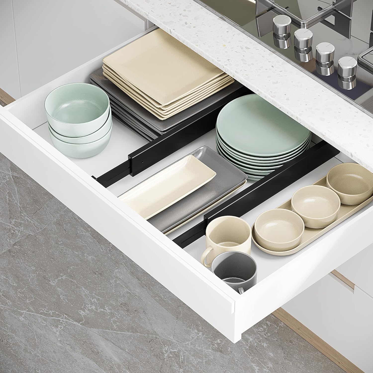 - MULTIPUL USED FOR ORGANIZATION: You can use BAMEOS drawer dividers in any drawers of your bedroom, office, kitchen, living room and garage; It can keep your drawer neat and organized all the time