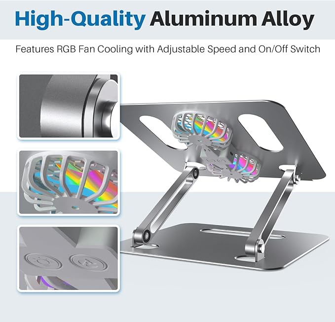 Adjustable Laptop Cooling Stand with 2 Quiet Fans & RGB Lighting, Aluminum Alloy & Foldable Ergonomic Design for MacBook, Lenovo, ASUS, Dell 10-16 Inch, Perfect for Gaming, DJ, Office - Silver