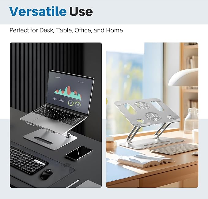 - Durable Aluminum Alloy Construction:Crafted from premium aluminum alloy, this laptop stand is both durable and lightweight. The anti-slip silicone pads securely hold your laptop in place, providing stability for devices up to 16 inches, including MacBook, Lenovo, ASUS, and Dell.