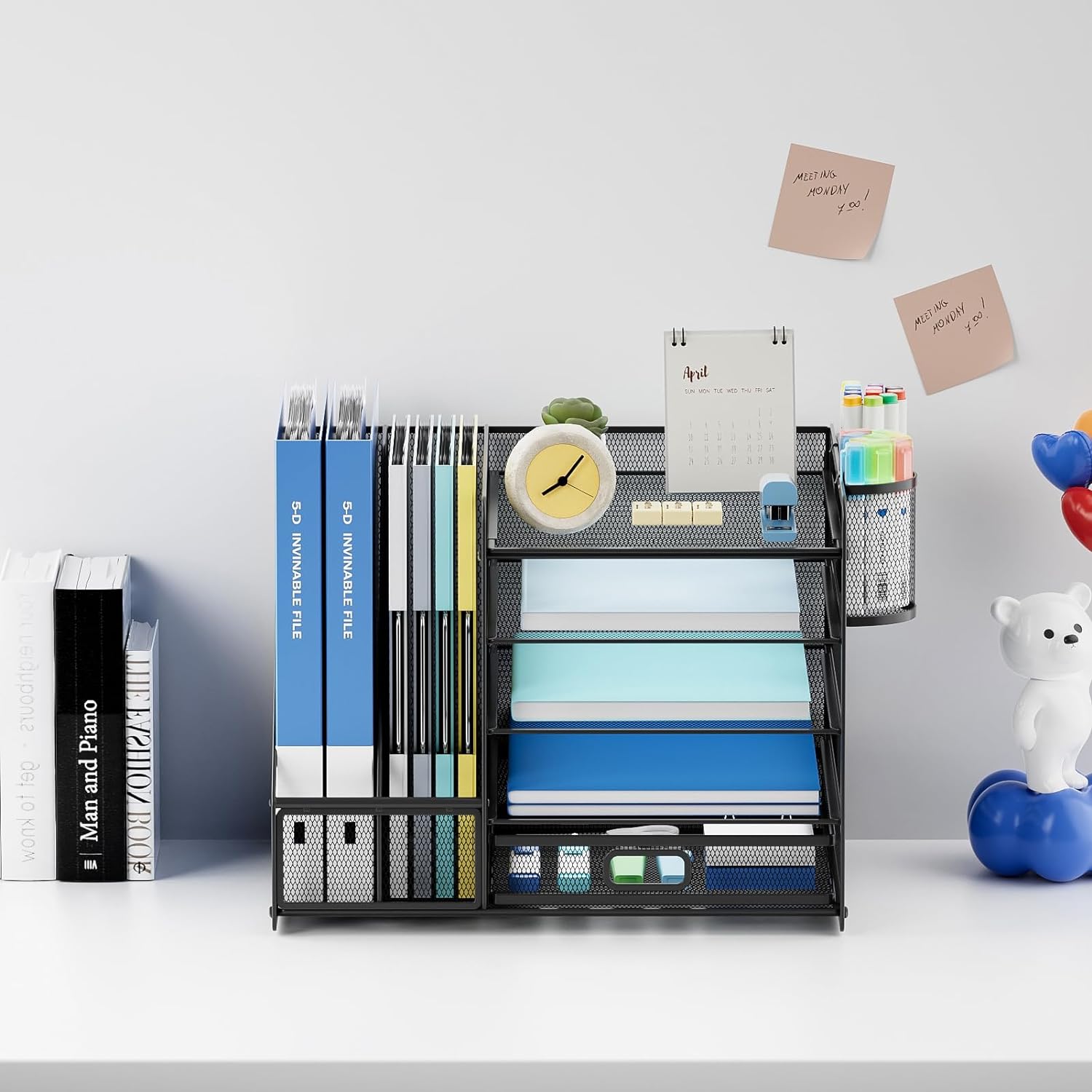 - Space-saving Design: This desk organizer has enough space to organize the items needed for the office. The magazine racks are great for folders and magazines,2 hanging pen holders can help you store all kinds of pens.
