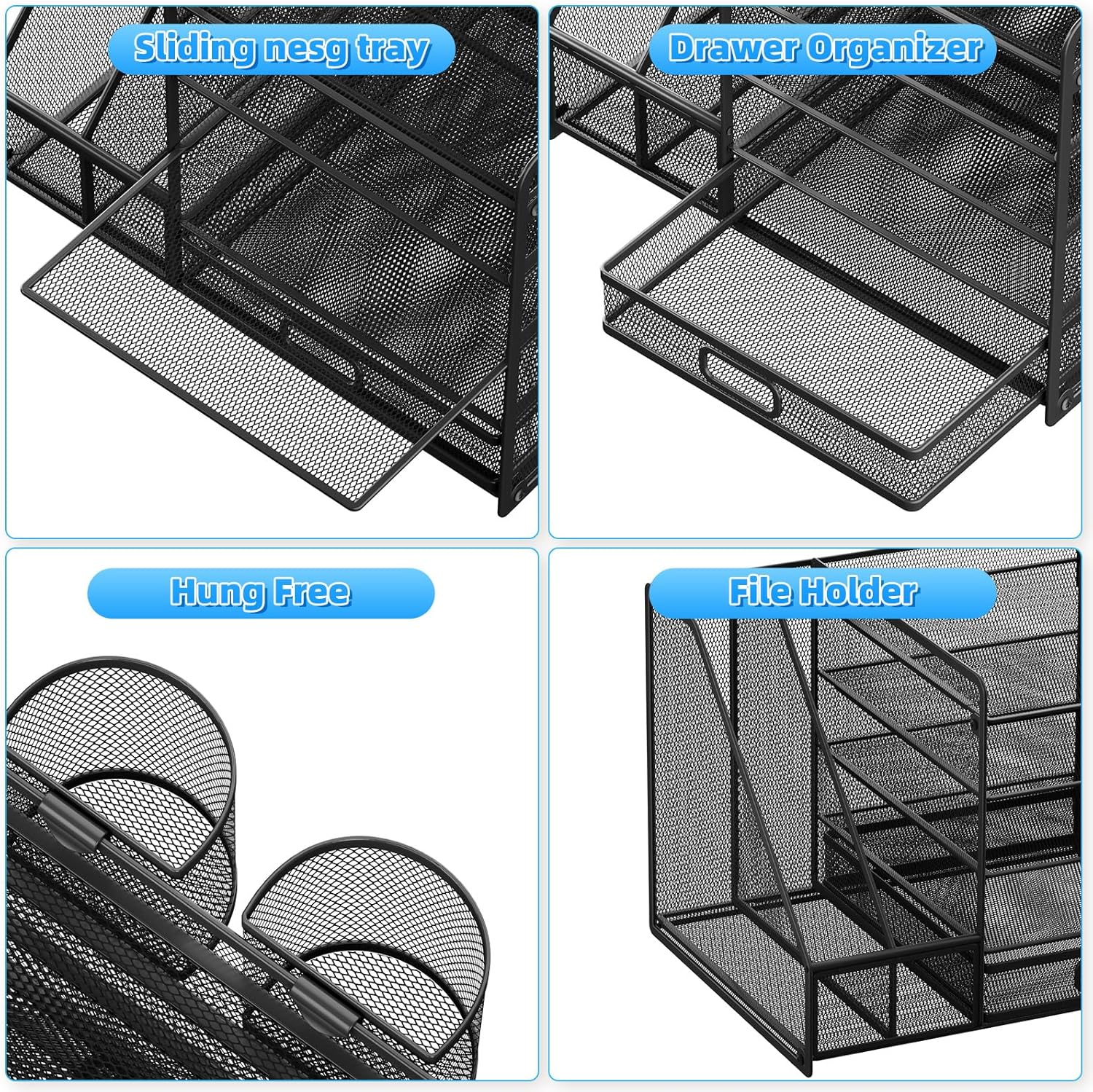 - Durable Material: The office supplies desk organizer is made of lightweight durable metal mesh structure and solid steel frame that makes it have long-lasting strength and stability.