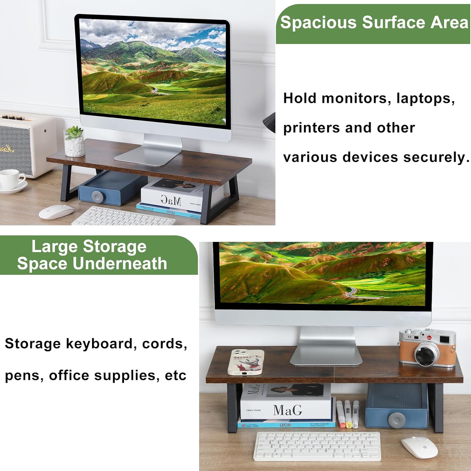TEAMIX 24 inch Monitor Stand Riser, Rustic Brown Wood & Steel Computer Monitor Stand with Storage, Laptop, PC, Printer Stand Riser for Desktop Office Desk Organizers