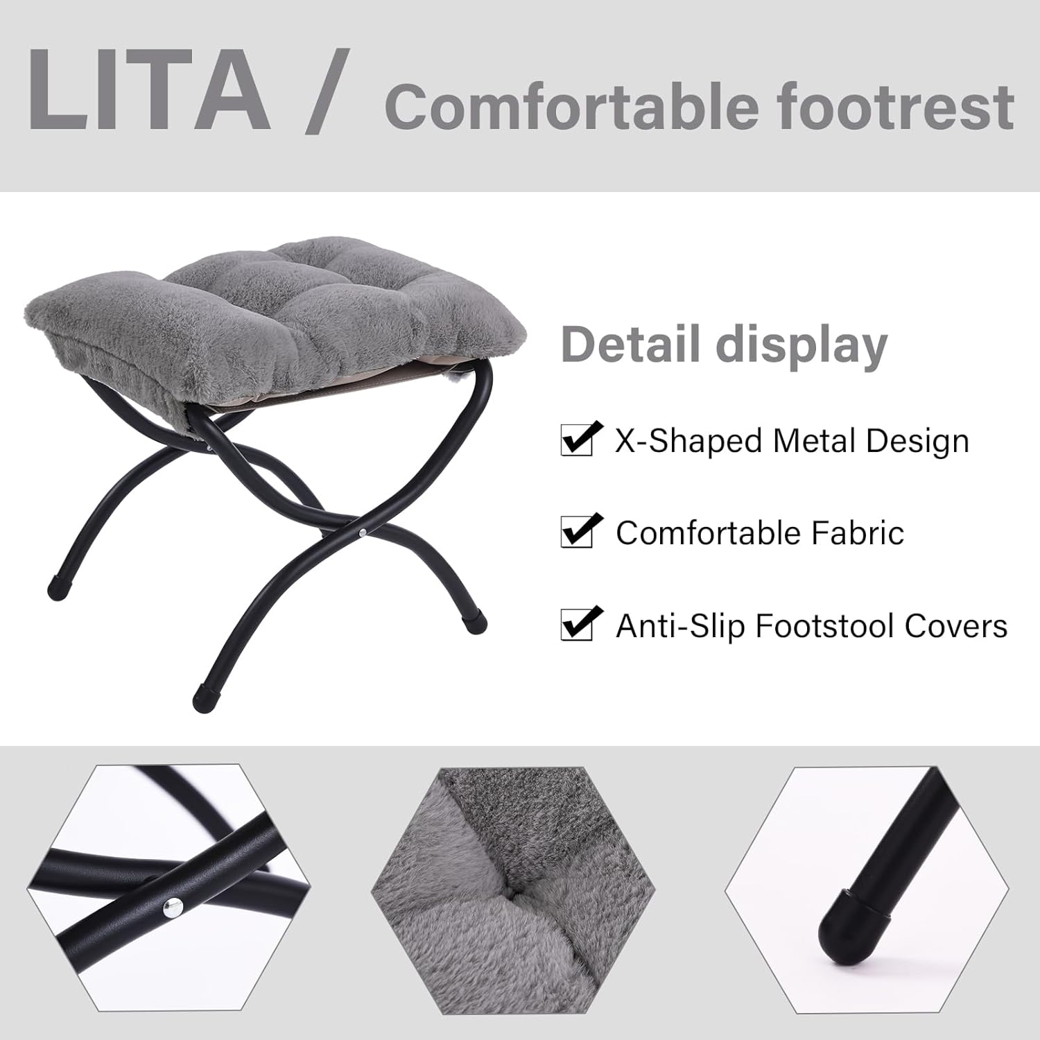 - STABLE AND DURABLE FOOTREST: This modern footstool features X-shaped legs for added sturdiness, and metal tube legs are designed to support heavy loads. Plus, four non-slip footrest covers protect your floor from scratches and prevent you from falling.