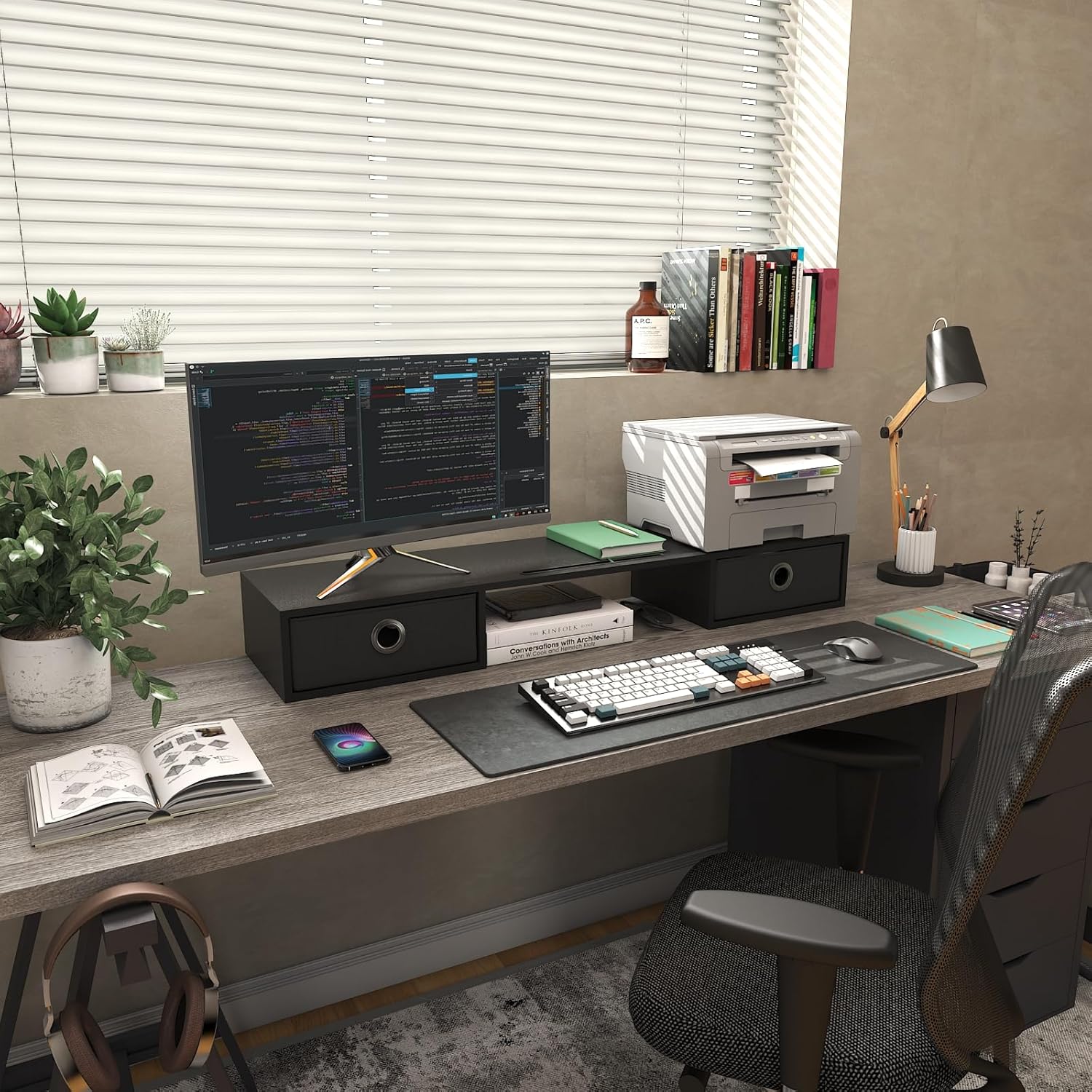 - 【Monitor Stand with 2 Drawers】Our computer monitor riser includes practicality slide-out drawers, for storing items like post-it notes, writing utensils and mobile devices.