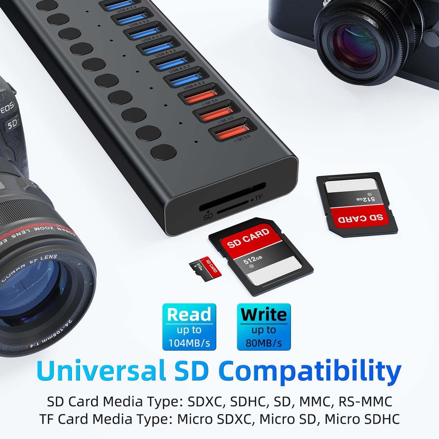 - 17 IN 1 Powered USB 3.2 Hub: VANGREE Powered USB Hub equips with 10 x USB-A 3.2 ports, 3 x USB-A QC3.0 (24W) fast charging ports, 2 x USB-C 3.2 ports, SD/TF card reader. Note: 3 fast charging ports do not support data transmission.