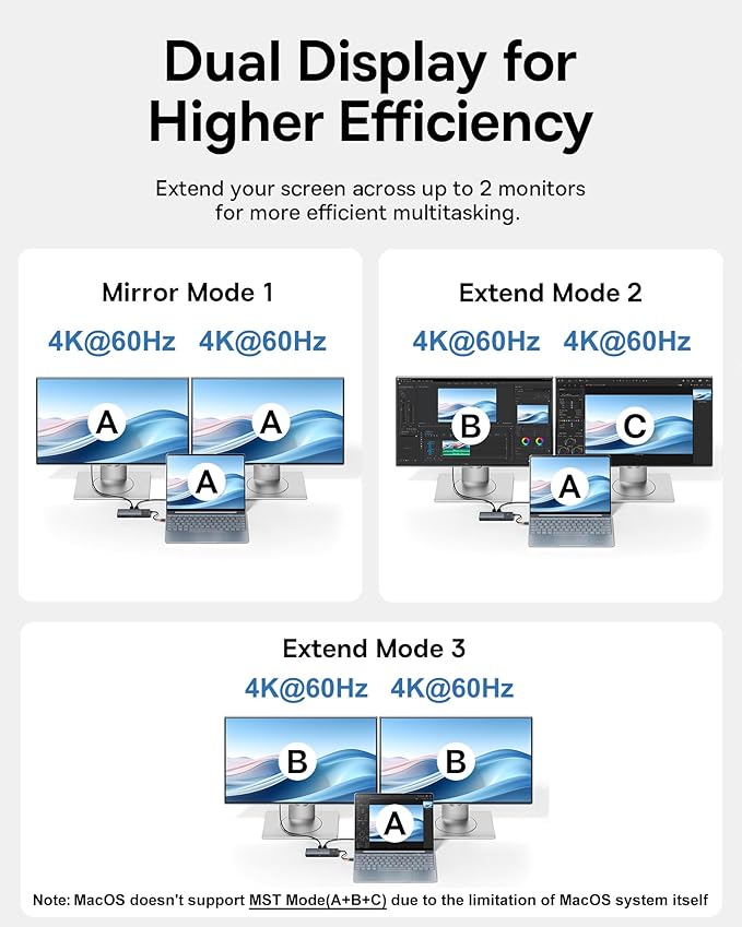 - Dual Display with 4K Clarity: Just cast your screen by using one HDMI port of our laptop docking station and enjoy the stunning 4K@120Hz clarity. Or experience the ultimate visual delight with dual display in 4K@60Hz resolution on both HDMI ports. Immerse yourself in a truly remarkable viewing experience that will captivate your eyes. *Note: Due to the limitation of macOS itself, all extended screen content will be the same. And 4K@120Hz output can be achieved With Windows Laptops under Thunderbolt 4 or DP1.4.