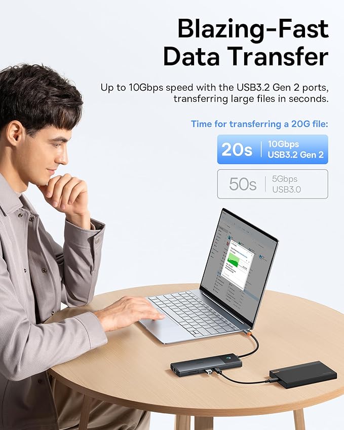 - Super-Fast 10Gbps Data Transfer: Up to 10Gbps data transmission speed with the 2 USB 3.2 ports including 1 USB-C Data Port and 1 USB-A Data Port, transferring your big files and pictures in seconds. And the SD/TF card slot allows you to read your memory cards at the same time with speed up to 104MB/s.You can quickly access and transfer your important data without any delays.