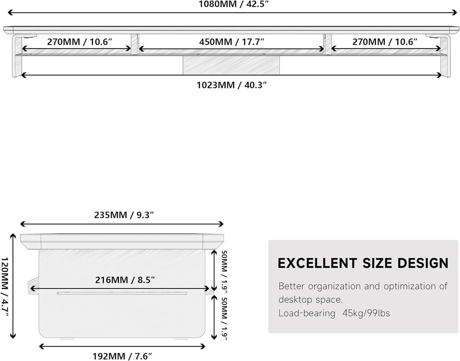 - 【Sturdy & Stable】: Monitor riser is 42.5 x 9.3 x 4.7 inches, with a board thickness of 0.7inches/18mm, and the middle layer is embedded with a whole piece of steel. The leg is made of 0.31inches/8mm high-quality acrylic material, the maximum load capacity is 45kg/99lbs, can easily handle either laptops or heavy monitors.