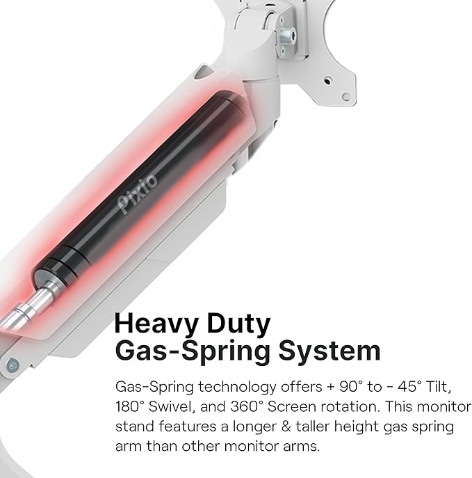 - Height & Articulation Adjustment: Gаs Spring Technology allows for no sagging during use. The arms offer full articulation: +90° to -45° tilt, 180° swivel, and 360° screen rotation. This monitor stand features a longer & taller height gas spring arm than other monitor arms, built for heavy duty application.