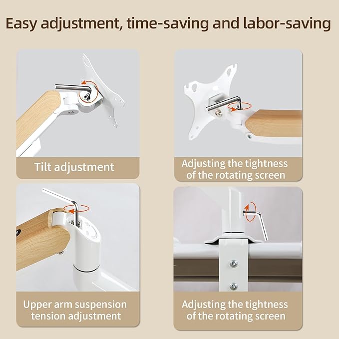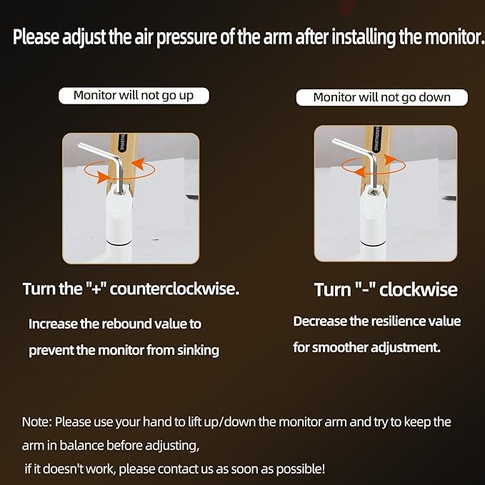 - Friendly Tip: Please install the monitor first and then adjust the air pressure on the monitor arm for better up and down. For better user experience, the front of the monitor arm needs to be 4.4-19.8lbs. If your monitor arm still doesn't work properly after adjustment, please feel free to contact us and we will reply you within 24 hours