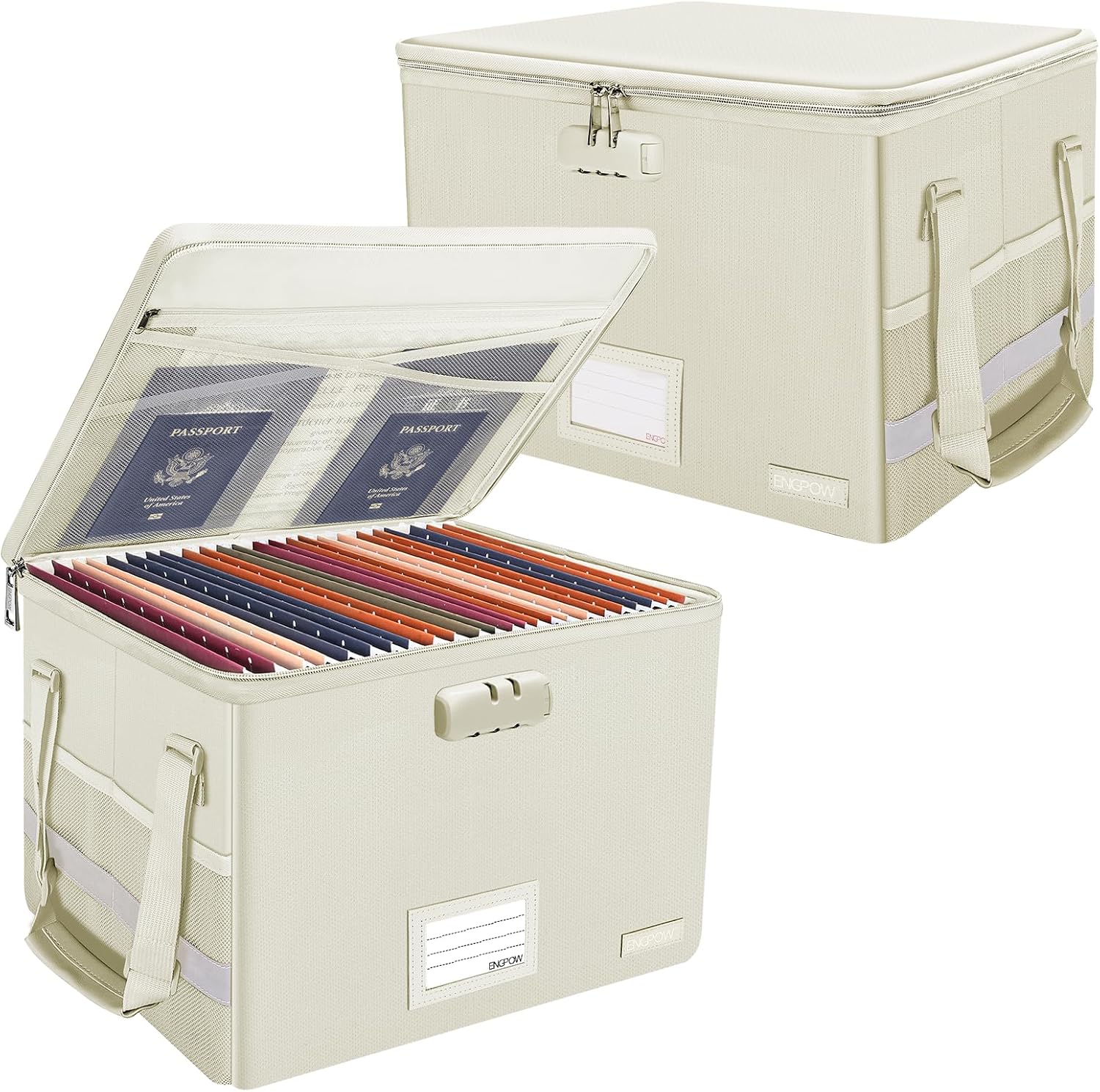 ENGPOW File Box with Lock,Fireproof Document Box with Zipper Lid,Collapsible File Storage Organizer Filing Cabinet with Handles,Portable Home Office Safe for Hanging Letter/Legal Folders,Beige,2 Pack
