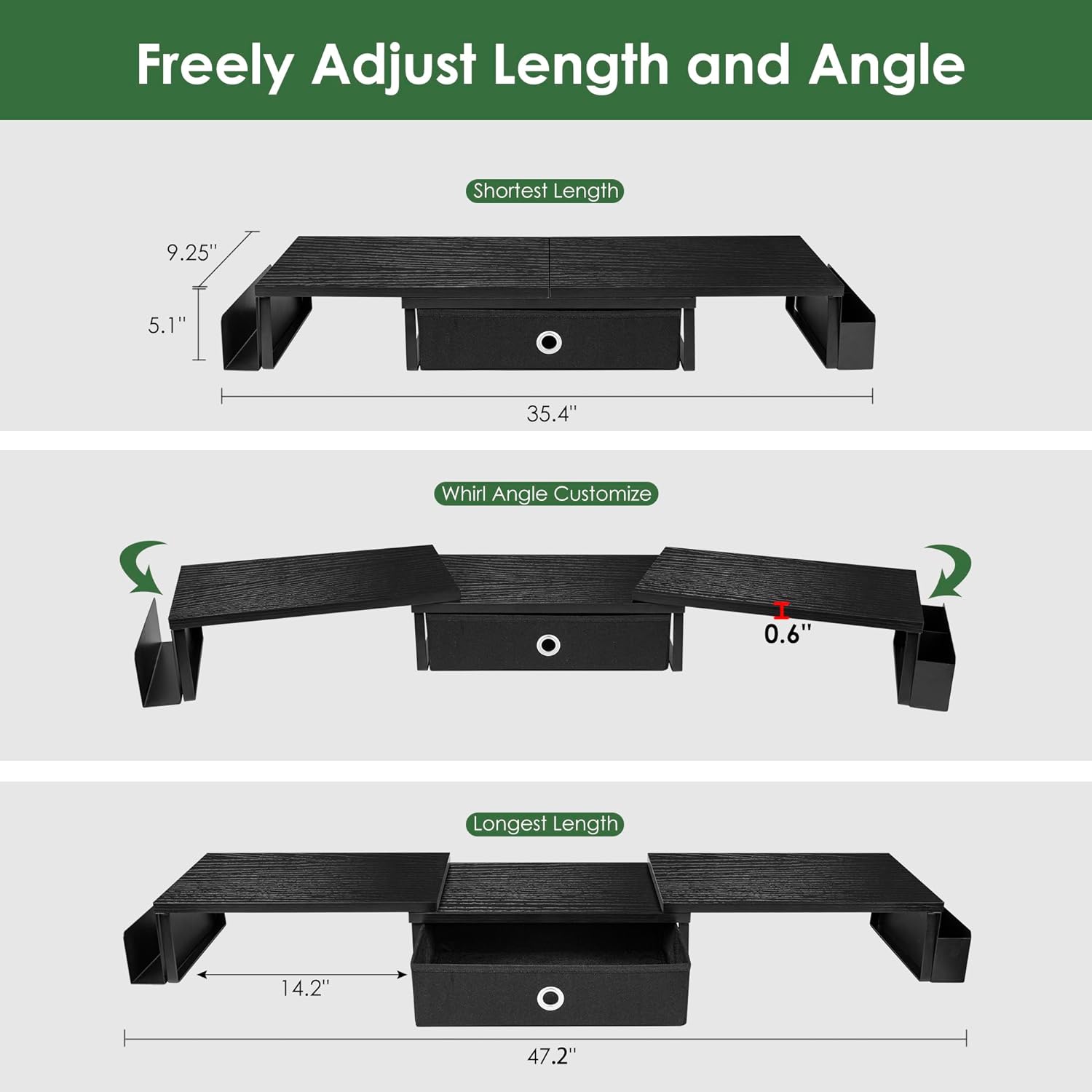 - Adjustable Angle & Length:The length of monitor stand riser with drawer can be adjusted from 35.4 to 47.2 inches, and angle can be adjusted +/-90 degree to meet various office needs and obtain a better viewing experience. If you need multiple computers to work at the same time, you might as well choose our extra large monitor riser for 2 monitors.