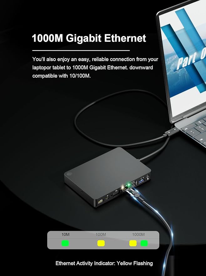 - 【Gigabit Ethernet & Fast Data Transfer】This Docking station ethernet port download movies quickly and reduce game lag. USB-C 3.0 No longer distinguish between data transmission and fast charging port, fulfill the 5Gb/s high speed rates data transfer at the same time.