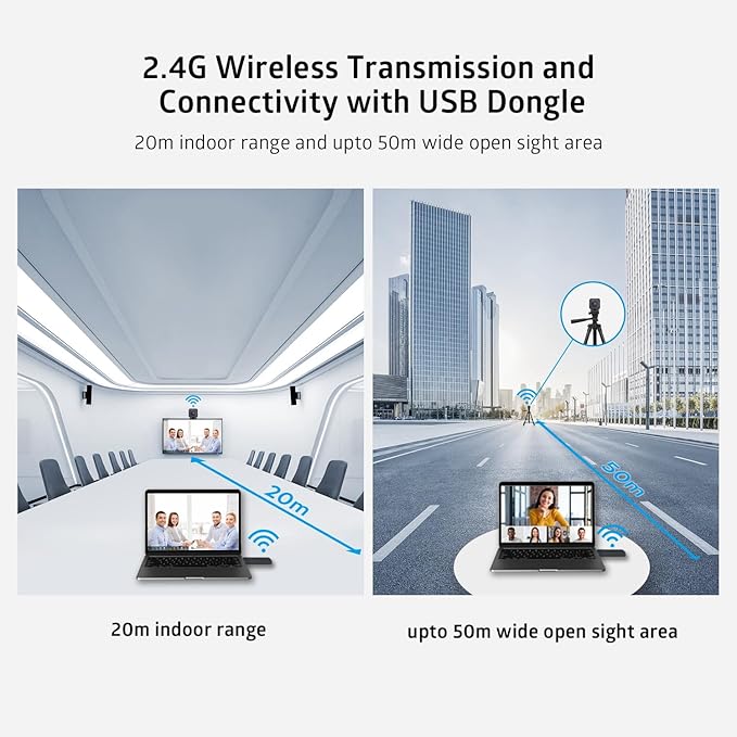 - 【2.4G Wireless Connectivity Webcam】20m indoor range and up to 50m wide open sight area 2.4G wireless transmission distance, you can place the camera in any location in real time without cable connecting, meet your video conferencing needs in any conference room.