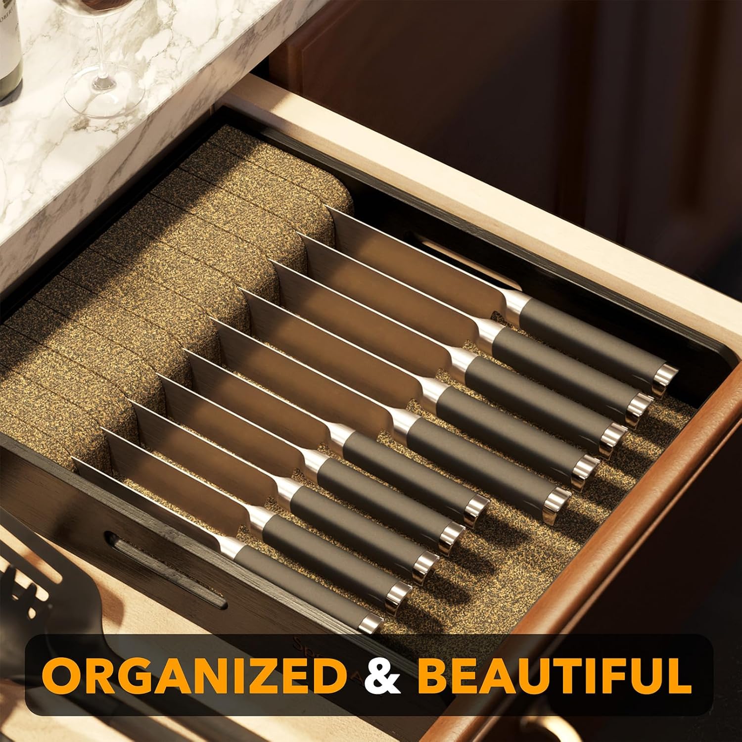 - BLACK ORGANIZED KNIFE DRAWER - Make your kitchen drawer neat and organized with bamboo knife organizer. The knives organizer is designed for your different knives kitchen drawer organization