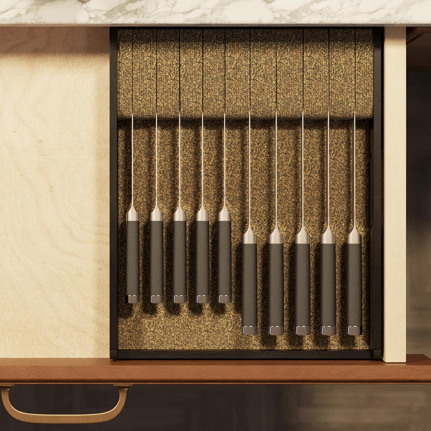 - FLEXIBLE DIVIDERS - Made from cork and rubber composite, this in drawer knives drawer organizer holds knives up to 12" long in place for storage; SIZE: 15"L x 12"W x 2.5"H