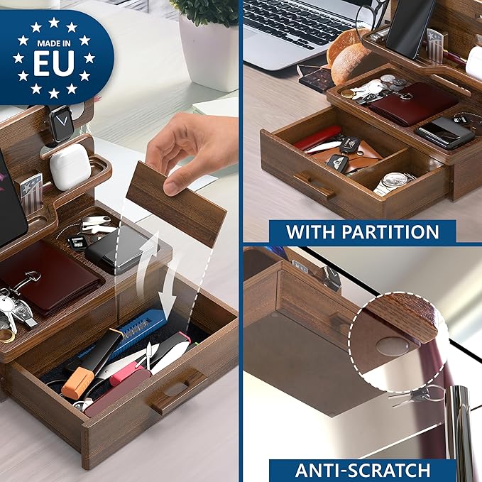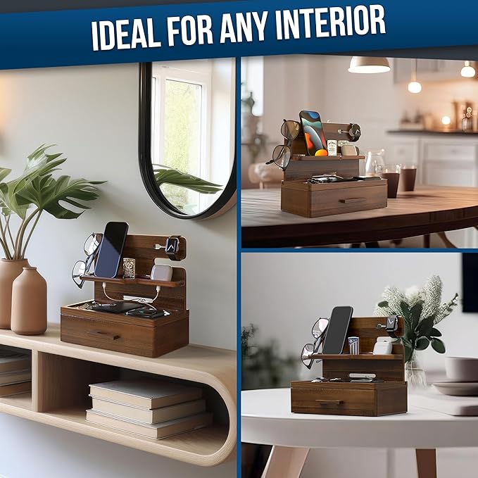- Multi-Functional - This night stand organizer provides efficient storage and organization for EDC stuff, including wallet, keys, smartwatch, jewelry, pens, and pencils. The wooden charging station for men is a great space saver on your side table.