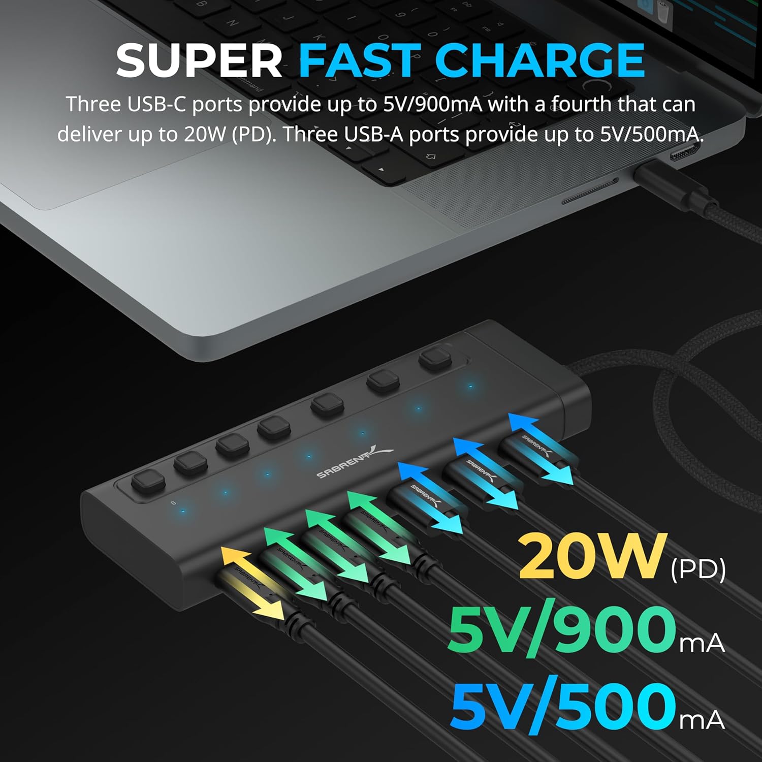 SABRENT 7-Port USB-C Hub with Power Switches, 5Gbps USB 3.2, 48W Powered Hub with 3 USB-A + 4 USB-C Ports, 20W PD, LED Status, Aluminum Body – for Mac, PC, Steam Deck, ROG Ally (HB-3A4C)