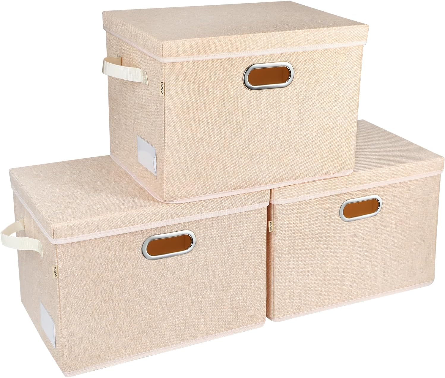 Voova Large Collapsible Storage Bins with Lids, 3 Pack Stackable Line Fabric Cube Storage Organizer, Foldable Closet Storage Boxes Baskets Containers with Cover for Clothes Bedroom Office Home,Apricot