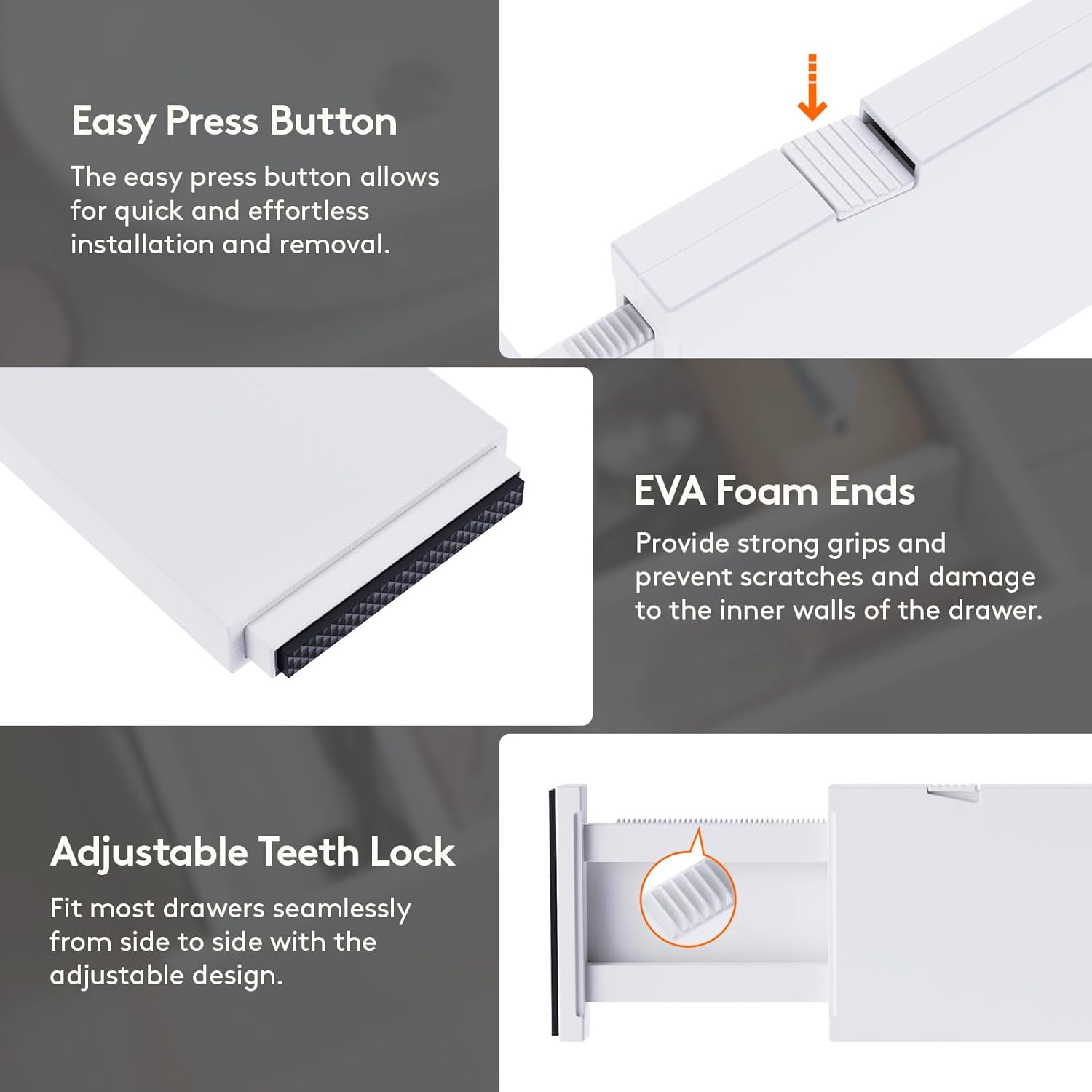 - Easy to Install: To adjust the length, press the top button before placing the drawer organizer, and then stretch it out again to secure it tightly. The strong spring tension keeps each organizer upright and secure. When retracting, press the top button and push in the stretched side.