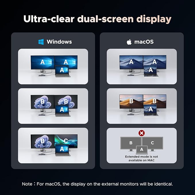 - Wide Adaptability: The Type-C docking station is compatible with ThinkPad X1, ZenBook, Chromebook, Surface, etc. Note:Windows systems can utilize an extended dual-screen display, Mac devices are limited to mirror mode.If you are a Mac user and want two external monitors to display different images, we do not recommend using this dock.
