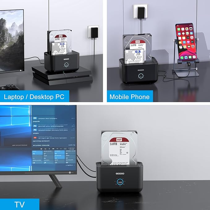 - 【GODO Hard Drive Docking Station】GODO 2 bay external hard drive docking station USB 3.0 supports all 2.5''/3.5'' SATA I/II/III HDDs/SSDs, support 2×18TB ,this sata hard drive dock compatible with Windows,Mac Os,Linux series