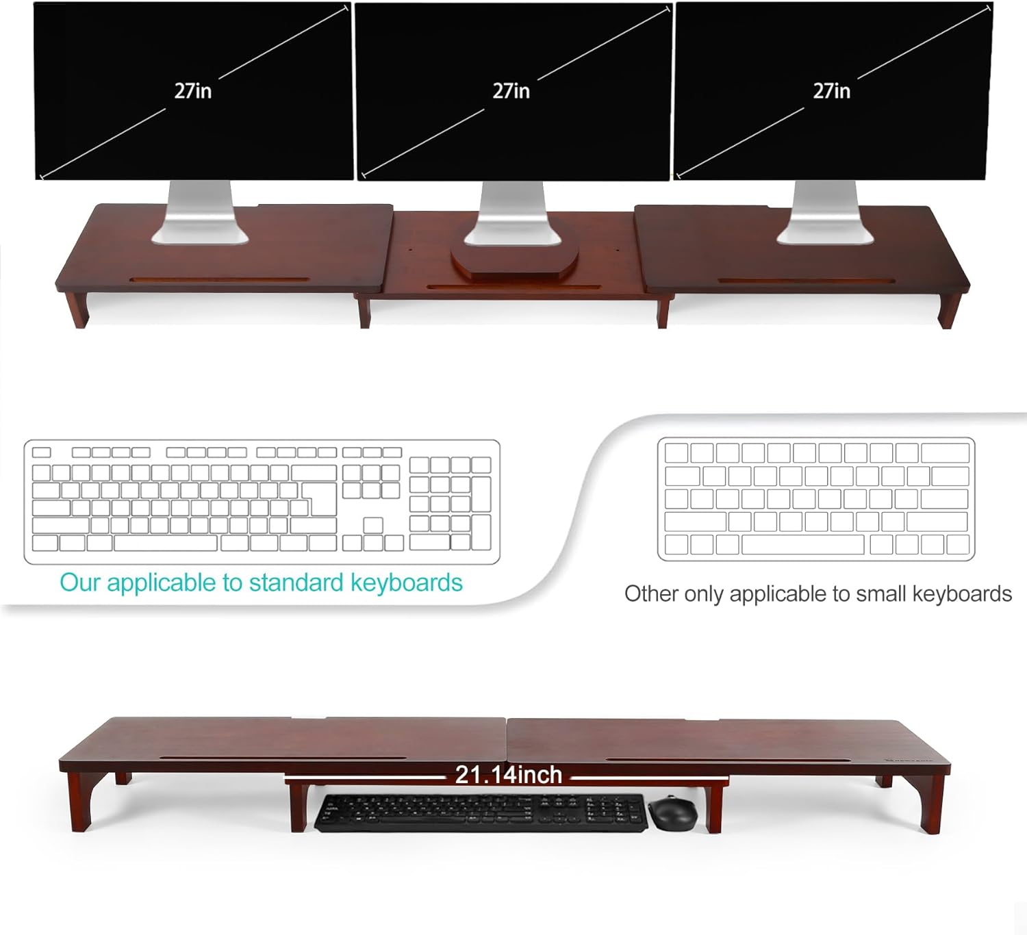 Nnewvante Large Dual Monitor Stand Riser, 60 inch Bamboo Monitor Stand with Adjustable Length and Angle, 3 Shelves Desktop Screen Riser for Computer Laptop PC, Walnut