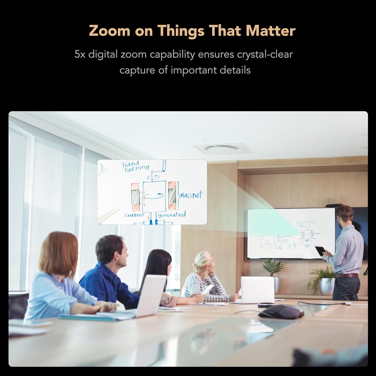 - AI-Powered Auto Framing & 5X Zoom: The C46 conference room camera employs self-developed face recognition technology for precise framing of single and multiple participants. With automatic frame adjustment as more participants join, it keeps everyone in the optimal position. Additionally, the camera offers up to 5x zooming capacity, allowing users to focus on essential details with remote control.