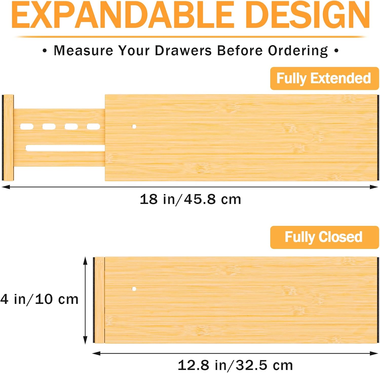 Bamboo Drawer Dividers 4" High, 12.8-18" Adjustable Drawer Organizers for Clothes,Expandable Dresser Separators in Bedroom/Kitchen/Bathroom/Office Organization and Storage,6 Pack