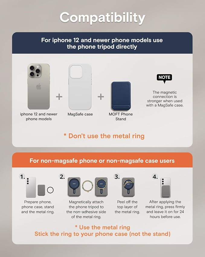 - Universal Compatibility: MOFT Phone Wallet is compatible with iPhone 16/15/14/13/12 series and MagSafe cases. For other devices (such as Samsung) and non-magnetic cases, the phone stand can be attached using the included magnetic ring. Please check the product dimensions (3.8in X 2.5in X 0.35in) to ensure it fits the back of your phone without obstructing the camera. The slim design ensures your phone’s lenses stay unobstructed—perfect for Instagram-worthy shots at cafes or business events.