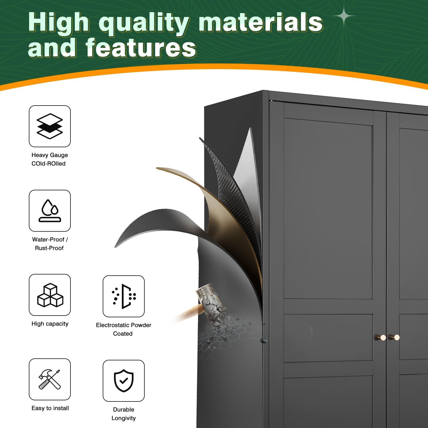 - Superior Materials : Our wardrobe is constructed from large thickened cold-rolled steel plates for exceptional strength and durability. The wardrobe is finished with an electrostatic powder coating, making it scratch resistant, wear resistant and easy to clean. This design is more durable than traditional wooden wardrobes.