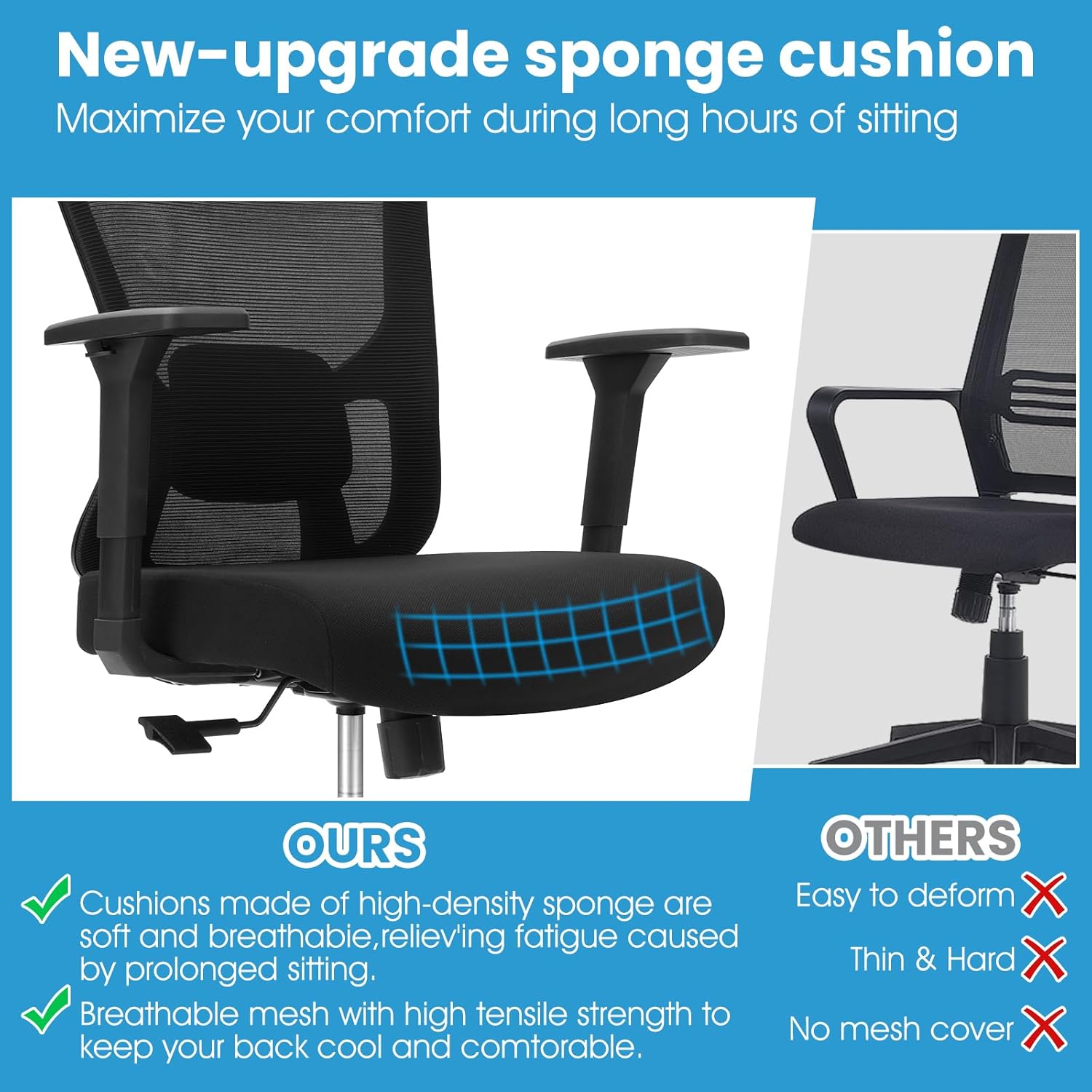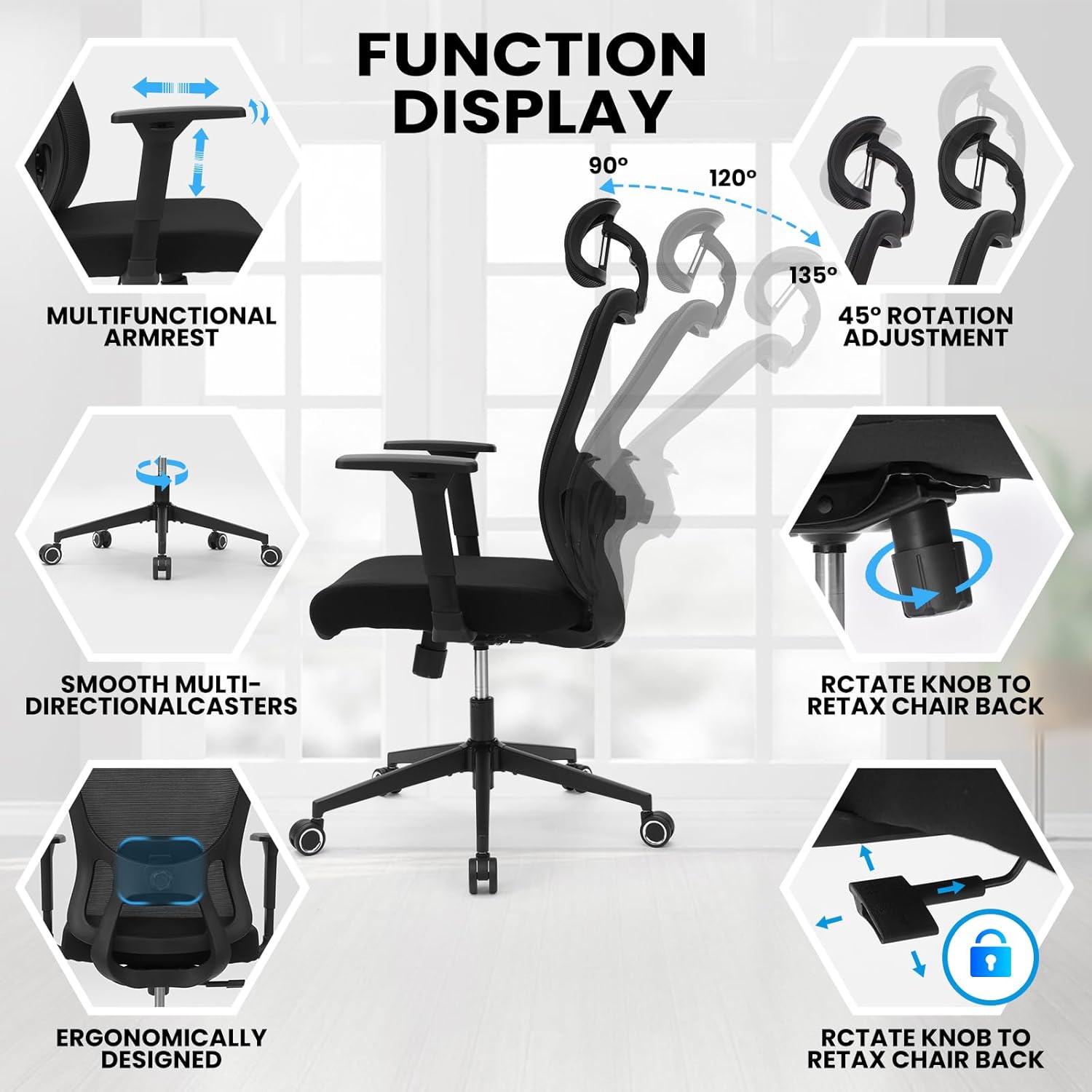 Ergonomic Office Mesh Chair, High Back Swivel Comfty Desk Chairs- 3D Armrest Adjustable Lumbar Support Capacity 400lbs and Headrest Wide for Home & Office, Bedroom (Black)